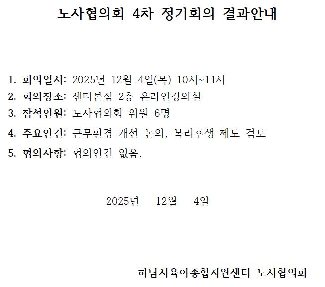 [Çϳ²½ÃÀ°¾ÆÁ¾ÇÕÁö¿ø¼¾ÅÍ]³ë»çÇùÀÇȸ 4Â÷ Á¤±âȸÀÇ °á°ú¾È³»